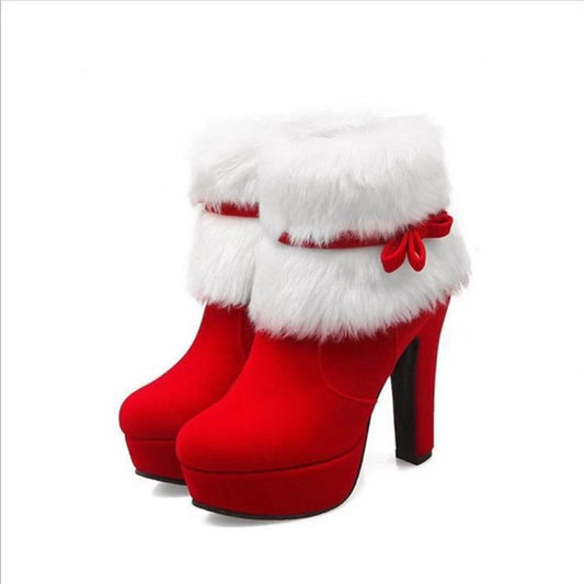 Christmas Red High-heeled Boots And Furry Bow Short Boots