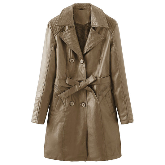 Women's Mid-length Plus Velvet Leather Jacket With Lapel