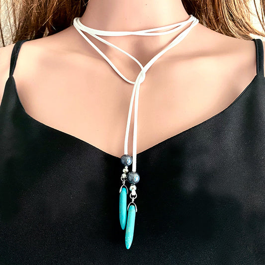 Woman Western Cowboy Turquoise Pearl Pendant Leather Cord Necklace