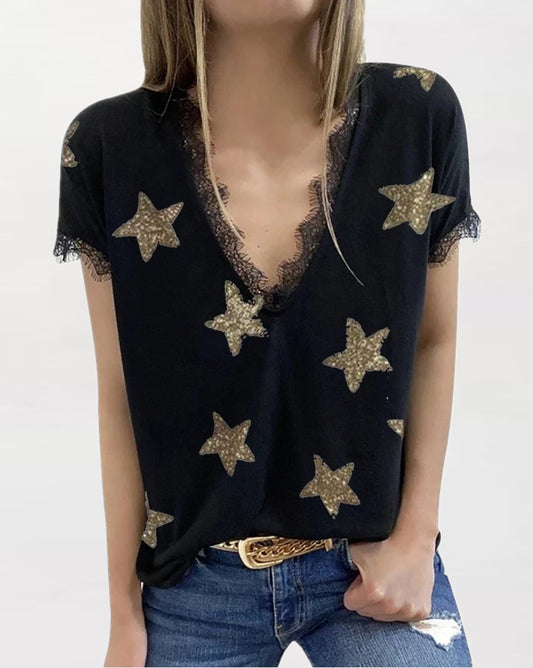 Women's Tee V-neck Feather Lace Sleeve Shirt