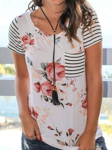 Women's T-Shirt Floral Striped Splicing Pocket Casual Tee