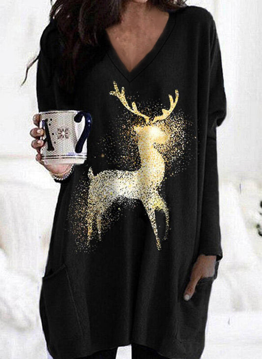 V-neck Women's Reindeer Print Long T-shirt