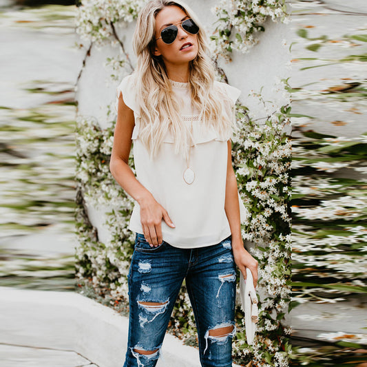 Women's Shirt Ruffled Chiffon Loose Round Neck Tank