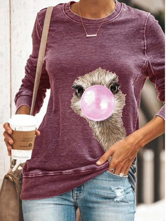 Women Animal Ostrich Print Long Sleeves Casual Tee Shirt