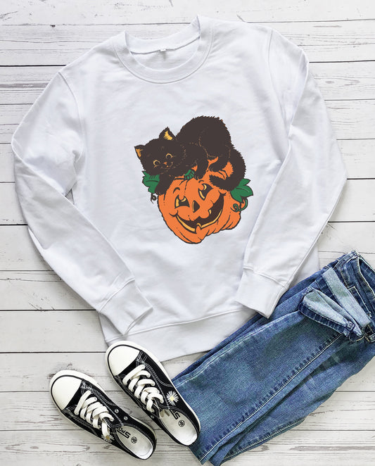 Women's Crew Neck Sweatshirt Halloween Pumpkin Cat