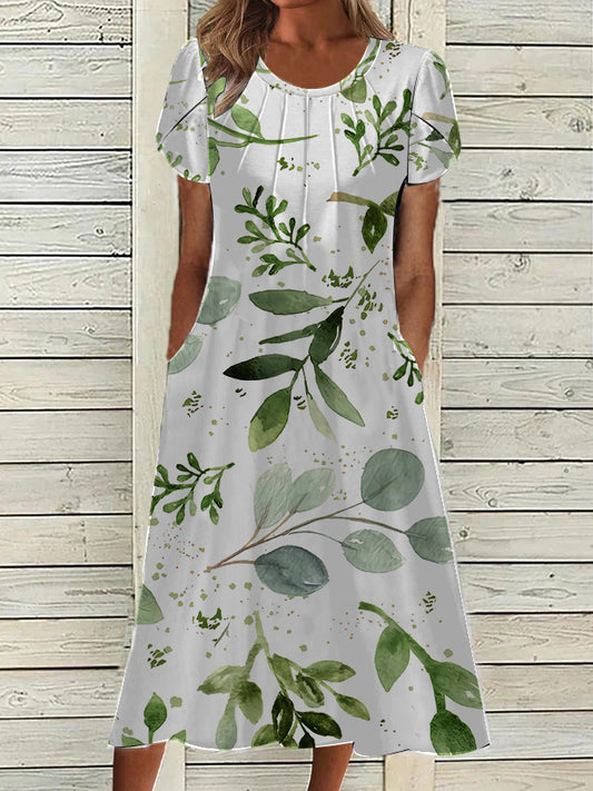 Women's Floral Print Round Neck Short Sleeve Pocket Dress