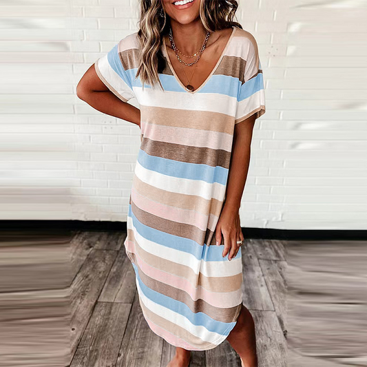 Loose Striped V-Neck Short Sleeve Maxi Dress