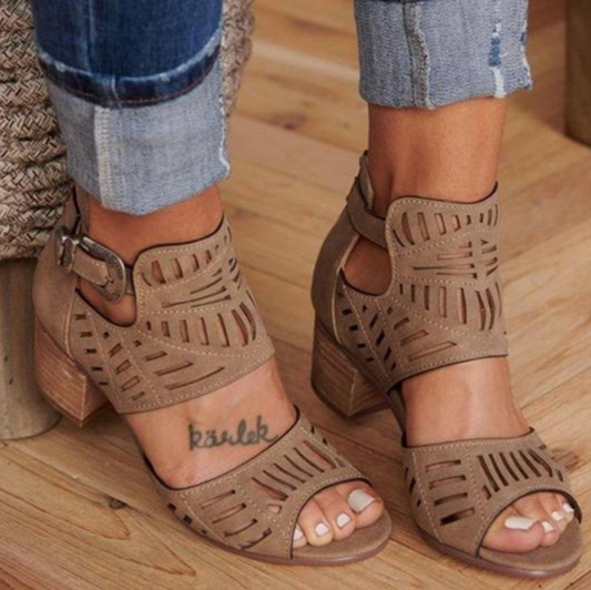 Women Thick Heels High Heels Pointed Buckle Hollow Shoes