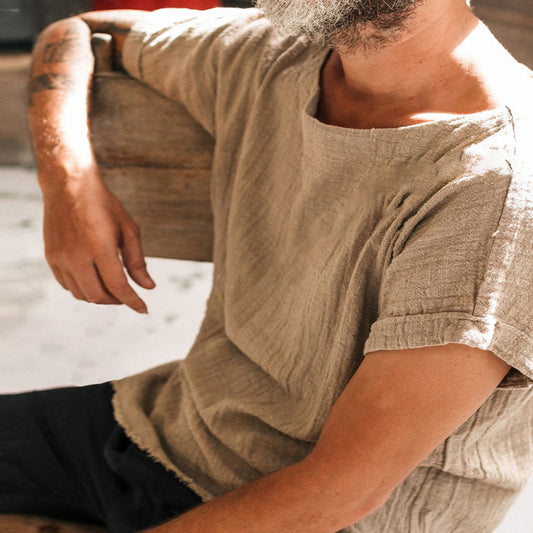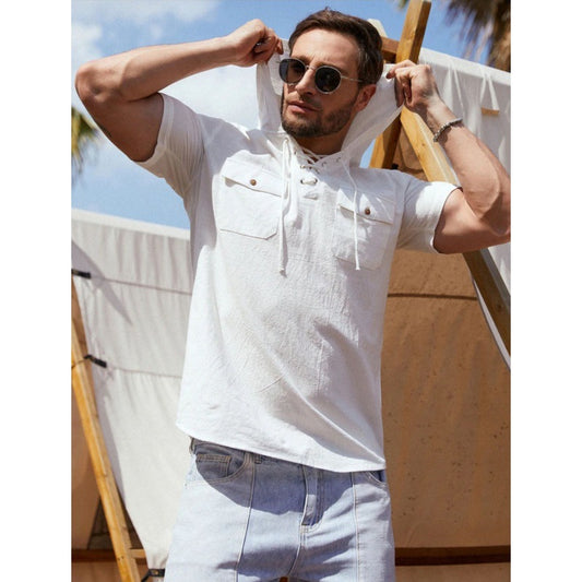 Summer Men's Shirt Casual Hooded Pocket Cotton Linen T-Shirt