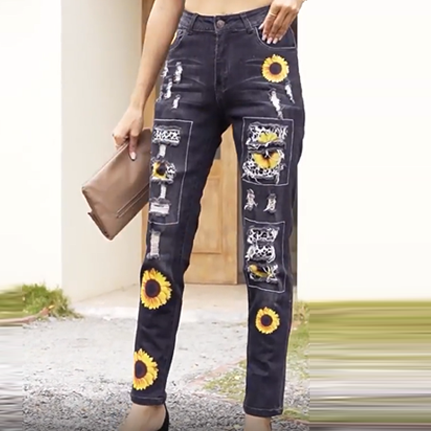 Women's Sunflower Print Denim Ripped Pants