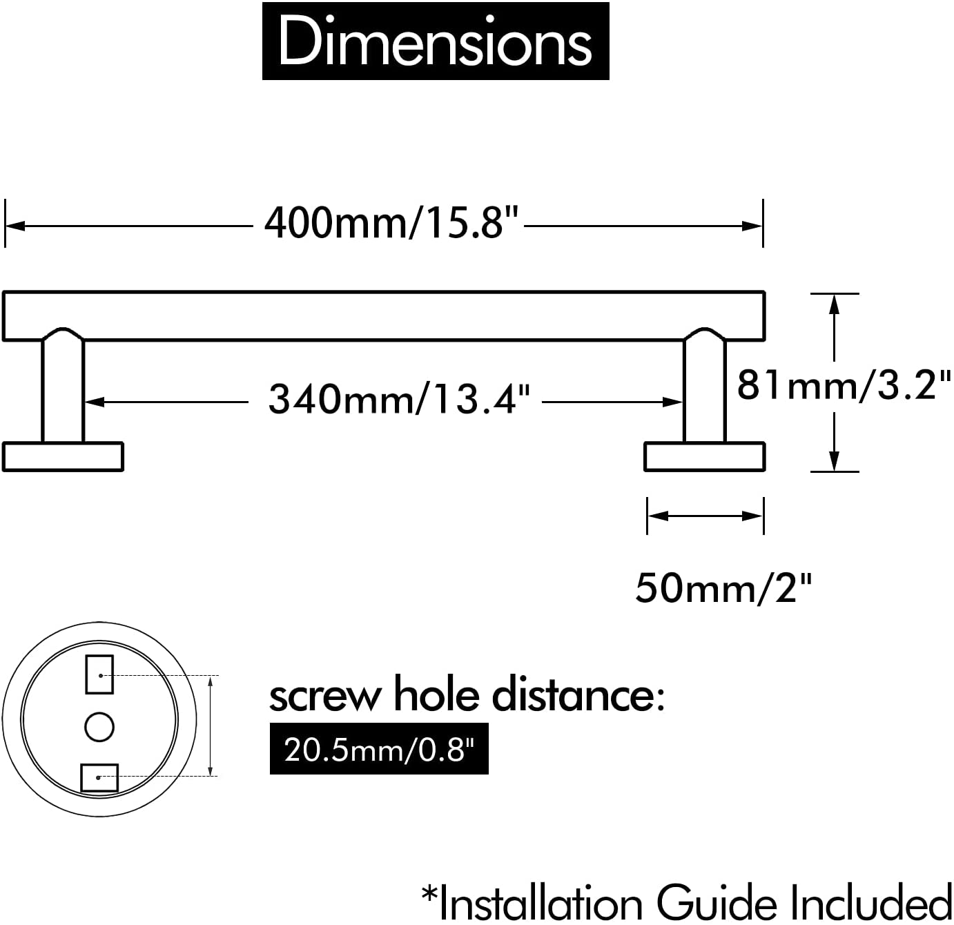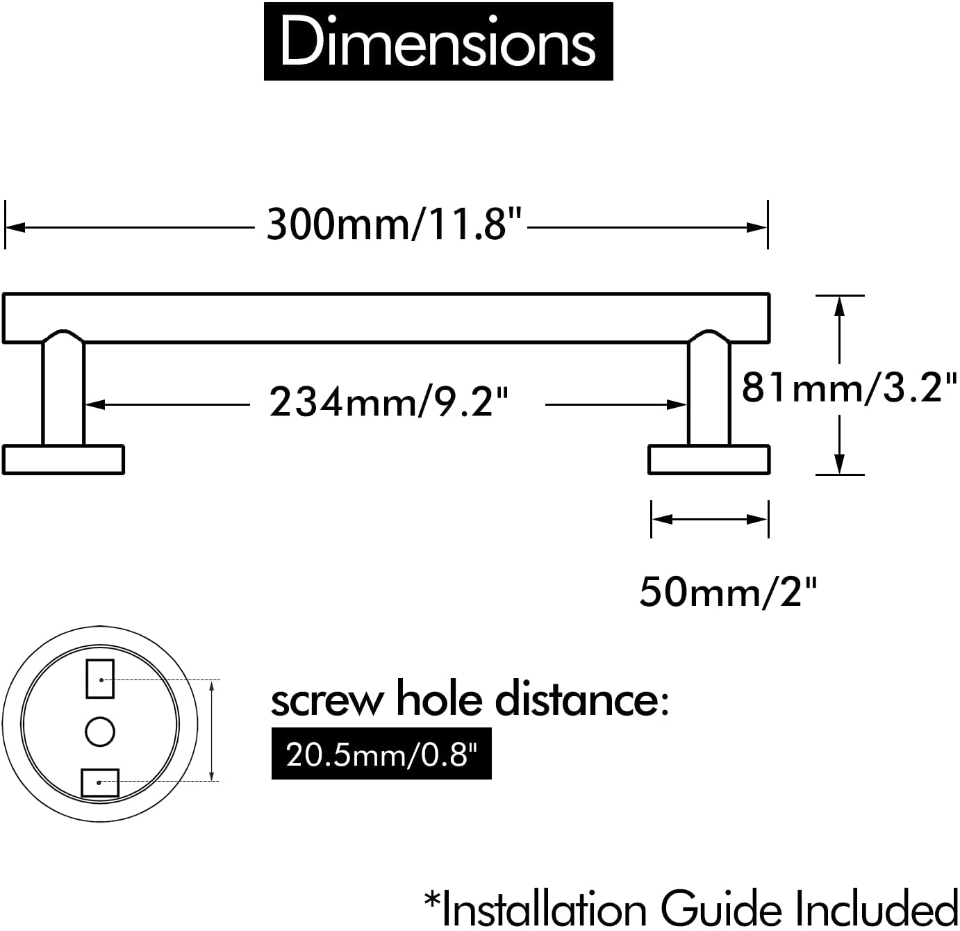 - DIMENSIONS: Overall length is 11.8" (300mm). The length of hanging space is 9.2" (234mm). Projection is 3.2" (81mm). This towel bar can be used in kitchens, baths, and laundry rooms, you can mount it to either side of your cabinet or closet door for storing at-use hand and dish towels.