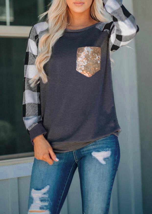 Plaid Splicing Sequined Pocket Long Sleeves T-Shirt