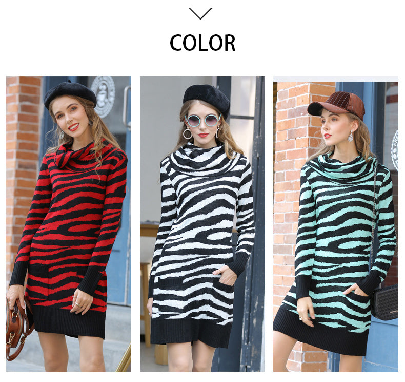 Woman Zebra Pattern Pile Neck Sweater Dress