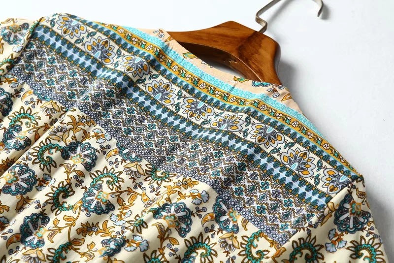 Bohemian playsuit made with a breathable cotton fabric mixed with soft rayon featuring floral print details.