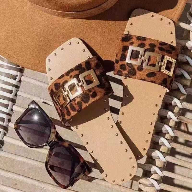 Women's Leopard Print Square Fashion Flat Outdoor Slippers