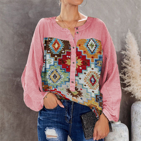 Women's Shirt Round Neck Shirt Button Retro Rrinting Long-sleeved